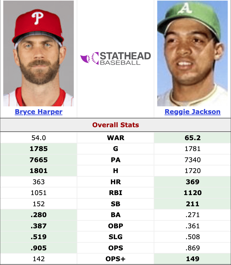 From the clutch home runs, to fame as a youngster, to the profile of his game, Harper has reminded me of a modern day Reggie Jackson. Their career numbers at roughly the same stage are eerily similar.
